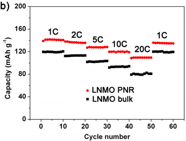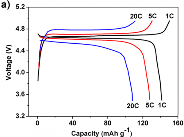 | 这是你的第一篇文献,就得从头说。相信这是一个锂离子电池的充放电图。首先说C是什么意思。每一种锂电活性材料都有一个理论的最大充电容量。比如是xxx mAh/g(毫安小时每克)。如果活性物质是1克,1C就是以这个xxx mA电流充放电,理论上1小时可充满,然后1小时可放净,即充放循环1圈。2C就是电流加倍,1/2小时可充满,然后1/2小时可放净。3C 4C等以此类推。图a是以不同的电流充放电,可以看到随着电流的增大,实际容量减小。图b,它是以1C充放10圈,然后2C, 5C, 10C,20C。可以看到随着电流的增大,实际容量减小。在同一电流下,随着循环次数,容量轻微减小,但损失不大。最后电流又回到1C实际容量又增大。 |
