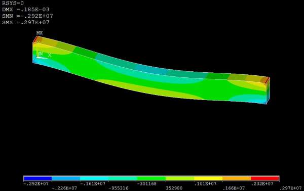 小弟最近在捣鼓ansys建模,就一个简单的梁,两端的面加三向位移约束。用的solid45模型,上部均布的面荷载,主要想看梁里的最大应力在哪然后配钢筋的。比如想得到梁底部最大拉应力,然后配纵筋。现在问题是底部求的应力很小,梁尺寸4m*0.2m*0.4m的,上部面载40000n/m2,底部的最大拉应力只有1mpa左右,实际上应该是3mpa。还有想得到xy方向上的应力大小然后配弯起筋的,是不是选的单元类型不对还是什么情况?大侠们帮忙指导下!