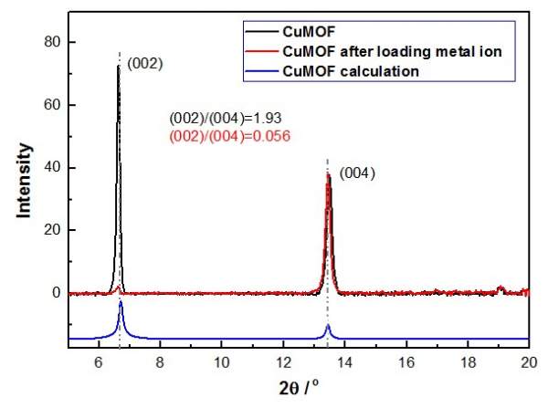 在制备MOF晶体载入金属离子过程中,空的晶体(001)/(002)相对关系和理论数据吻合,但是当载入离子后,(001)/(002)相对强度发生剧烈变化是由于什么原因照成的?如图所示,请高手指教 20131010113512.jpg |