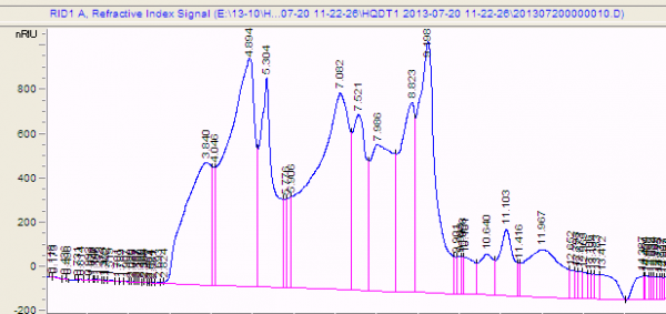 RID1A Mn: 8.853E+1 g/mol Mw: 5.660E+6 g/mol Mz: 4.814E+7 g/mol Mv: 0.000E+0 g/mol D: 6.394E+4 [n]: 0.000E+0 ml/g Vp: 9.201E+0 ml Mp: 8.015E+2 g/mol A: 4.175E+3 ml*V 10% : 6.8716e2 g/mol 30% : 7.9289e3 g/mol 50% : 6.6173e4 g/mol 70% : 1.6914e6 g/mol 90% : 1.5935e7 g/mol |