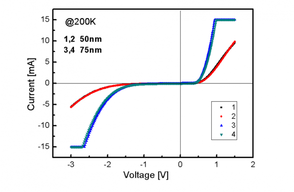这是做的一个异质结,12和34分别为不同厚度下的IV曲线,我想知道的是从这些曲线能得到什么样的对比信息,谢谢
