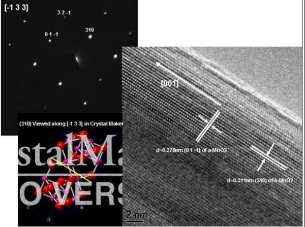 如图所示,是a-MnO2纳米线单晶的衍射斑点和高分辨TEM,如何确定其生长方向?求指导