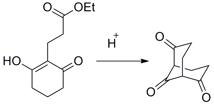 酸性机理,酯基的氧俘获一枚质子,然后环上羰基阿尔法未知的碳进攻酯基,酯基上的乙醇离去,烯醇自己变成羰基