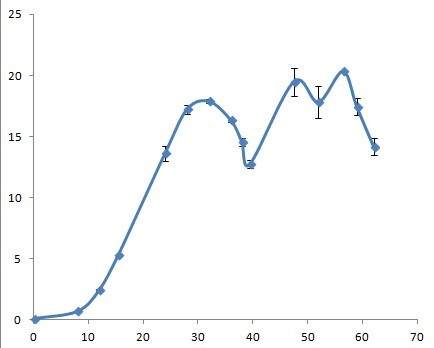 各位大虾,这是我做的酵母的生长曲线。我做了三次了,每次都是3个平行样。但是这三次实验的生长趋势都是这样的。在大概32h 的时候OD值突然下降,在大概40h时又突然上升。之后就一直波动,没有明显的稳定期。 我的培养基中的碳源是葡萄糖和果糖的混合物,不知道是不是碳源影响,才会出现突降和突升的现象。还有就是为什么在后期一直都在波动呢? 不知道是什么原因,烦请各位大虾指点下~谢谢~! 1.jpg |