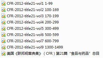 FDA-Code of Federal Regulations (CFR)-Title 21-Food and Drugs 美国《联邦规章典集》(CFR)第21篇“食品与药品” 概述:美国《联邦规章典集》(Code of Federal Regulations,CFR)第21篇“食品与药品”(Title 21―Food and Drugs)共有9卷(Volume)、3章(Chapter)、1499部(Parts)。其中:第1―8卷第1章第1―1299部,为健康与人类服务部食品与药品管理局(Food and Drug Administration,Department of Health and Human Services)的规章;第9卷第2章第1300―1399部,为司法部毒品强制执行局(Drug Enforcement Administration,Department of Justice)的规章;第9卷第3章第1400―1499部,为毒品控制政策办公室(Office of National Drug Control Policy)的规章。 百度网盘下载地址:http://pan.baidu.com/s/1EE9nC 具体目录参见:http://www.fdc-intl.com/detail_info/detail_1195.html [ Last edited by 普弟 on 2013-10-14 at 11:11 ] 更新链接: http://pan.baidu.com/s/1qWnvO2C 密码: sbkj [ Last edited by 普弟 on 2014-10-9 at 09:43 ] |