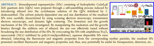 中科院化学所的高明远老师最新发表的文章,主要讲述了一种单分散的超粒子(CuInS2@ZnS)的合成,其是通过一种自组装过程。通过调节成核与生长过程,SP超粒子的尺寸可以被调节。通过在SP外面包裹一层Fe3O4纳米粒子,可以得到水溶性的分散态的SP。 3.png |