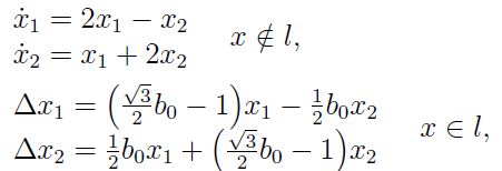 有以下脉冲微分方程,请高手赐教如何用Matlab求解并画图,多谢了!!! l: 其中,最后一个式子表示脉冲线l, b0 为一常数。 [ Last edited by mathsxdg on 2013-10-15 at 21:23 ] |
