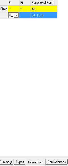 我想用MS做个LJ流体的简单模拟,在forcite->forcefield manager下编辑力场,在interactions选项要输入各个LJ参数,但是我查到的LJ参数都是分子的参数,而下拉菜单中都是原子选项,该怎么处理呢?求大侠指导 lj参数.png 烦人.png [ Last edited by tim562944200 on 2013-10-16 at 17:18 ] |