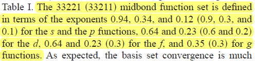 请问诸位网友,大家有没有了解“AO basis set (Overlap normalization)”的? 我用gen关键词在Gaussian输入文件里输入基组信息,但是在log文件里输出的基组系数d有了变化,应该是因为“Overlap normalization”而变化,但是我试了各种可能归一化的方法,都不能由gjf里的系数d得到log文件里的系数d (下面给出了数据)。诸位有没有知道怎样由gjf里的系数d得到log文件里的系数d的?(基组的定义,可以参考gen的使用方法:http://www.gaussian.com/g_tech/g_ur/k_gen.htm) 第二个问题,文献中一般给出基组的指数,不给出系数,请问这种情况下默认习俗d为1吗?如下面的部分: P 3 1.00 0.9000000 1.0000000 0.3000000 1.0000000 0.1000000 1.0000000 参照文献:http://dx.doi.org/10.1063/1.1809606 搜索“0.9”,文献中只给出了指数部分,0.9, 0.3, 0.1,但是没有给出系数部分。那么我现在这样输入对吗?高斯可以优化基组的系数d吗? Ar.gjf ==================================== %chk=Ar-mp2-basis-1013-2.chk %mem=200MW %nprocshared=8 #p mp2/gen counterpoise=2 GFprint Title Card Required 0,1 0,1 0,1 Ar(fragment=1) Ar(fragment=2) 1 r1 r1 3.75716 Ar 0 S 13 1.00 950600.0000000 0.227545D-04 142300.0000000 0.176945D-03 32360.0000000 0.931282D-03 9145.0000000 0.392860D-02 2970.0000000 0.142064D-01 1064.0000000 0.448114D-01 410.8000000 0.121001D+00 168.0000000 0.260579D+00 71.9900000 0.381364D+00 31.6700000 0.276058D+00 12.8900000 0.505179D-01 5.9290000 -0.359866D-02 2.6780000 0.218798D-02 S 13 1.00 950600.0000000 -0.646201D-05 142300.0000000 -0.502346D-04 32360.0000000 -0.264804D-03 9145.0000000 -0.111895D-02 2970.0000000 -0.408276D-02 1064.0000000 -0.131216D-01 410.8000000 -0.372855D-01 168.0000000 -0.894709D-01 71.9900000 -0.168054D+00 31.6700000 -0.179594D+00 12.8900000 0.102953D+00 5.9290000 0.562630D+00 2.6780000 0.450355D+00 S 13 1.00 950600.0000000 0.202056D-05 142300.0000000 0.156851D-04 32360.0000000 0.828617D-04 9145.0000000 0.349264D-03 2970.0000000 0.127976D-02 1064.0000000 0.410365D-02 410.8000000 0.117789D-01 168.0000000 0.283868D-01 71.9900000 0.552406D-01 31.6700000 0.607492D-01 12.8900000 -0.362012D-01 5.9290000 -0.275398D+00 2.6780000 -0.362845D+00 S 1 1.00 0.9416000 1.0000000 S 1 1.00 0.4239000 1.0000000 S 1 1.00 0.1714000 1.0000000 S 1 1.00 0.0610000 1.0000000 S 3 1.00 0.9000000 1.0000000 0.3000000 1.0000000 0.1000000 1.0000000 P 8 1.00 1890.0000000 0.495752D-03 447.8000000 0.425172D-02 144.6000000 0.223277D-01 54.4600000 0.830878D-01 22.5100000 0.217110D+00 9.7740000 0.374507D+00 4.3680000 0.366445D+00 1.9590000 0.129245D+00 P 8 1.00 1890.0000000 -0.138863D-03 447.8000000 -0.118870D-02 144.6000000 -0.632553D-02 54.4600000 -0.238813D-01 22.5100000 -0.649238D-01 9.7740000 -0.115444D+00 4.3680000 -0.123651D+00 1.9590000 0.649055D-01 P 1 1.00 0.8260000 1.0000000 P 1 1.00 0.3297000 1.0000000 P 1 1.00 0.1242000 1.0000000 P 1 1.00 0.0435000 1.0000000 P 3 1.00 0.9000000 1.0000000 0.3000000 1.0000000 0.1000000 1.0000000 D 1 1.00 0.3110000 1.0000000 D 1 1.00 0.7630000 1.0000000 D 1 1.00 1.8730000 1.0000000 D 1 1.00 0.1160000 1.0000000 D 2 1.00 0.6000000 1.0000000 0.2000000 1.0000000 F 1 1.00 0.5430000 1.0000000 F 1 1.00 1.3250000 1.0000000 F 1 1.00 0.2940000 1.0000000 F 1 1.00 0.3000000 1.0000000 G 1 1.00 1.0070000 1.0000000 G 1 1.00 0.4590000 1.0000000 G 1 1.00 0.30000 1.0000000 **** ==================================== Ar.log部分 ==================================== AO basis set (Overlap normalization): Atom Ar1 Shell 1 S 11 bf 1 - 1 0.000000000000 0.000000000000 3.550001718716 0.9506000000D+06 0.2275175807D-04 0.1423000000D+06 0.1769230778D-03 0.3236000000D+05 0.9311677817D-03 0.9145000000D+04 0.3928063036D-02 0.2970000000D+04 0.1420418551D-01 0.1064000000D+04 0.4480098855D-01 0.4108000000D+03 0.1209535035D+00 0.1680000000D+03 0.2603652940D+00 0.7199000000D+02 0.3806534034D+00 0.3167000000D+02 0.2749002247D+00 0.1289000000D+02 0.5186220984D-01 Atom Ar1 Shell 2 S 8 bf 2 - 2 0.000000000000 0.000000000000 3.550001718716 0.2970000000D+04 -0.6579052432D-04 0.1064000000D+04 -0.8815076586D-03 0.4108000000D+03 -0.6532243164D-02 0.1680000000D+03 -0.3688168372D-01 0.7199000000D+02 -0.1385236786D+00 0.3167000000D+02 -0.2355345788D+00 0.1289000000D+02 0.2809792752D+00 0.5929000000D+01 0.9250458603D+00 Atom Ar1 Shell 3 S 8 bf 3 - 3 0.000000000000 0.000000000000 3.550001718716 0.2970000000D+04 0.1347482066D-04 0.1064000000D+04 -0.3757203412D-04 0.1680000000D+03 -0.1137835495D-02 0.7199000000D+02 -0.6800587524D-03 0.3167000000D+02 -0.1305137744D-02 0.1289000000D+02 0.6755540216D-02 0.5929000000D+01 -0.2711527151D+00 0.2678000000D+01 -0.7548268468D+00 Atom Ar1 Shell 4 S 3 bf 4 - 4 0.000000000000 0.000000000000 3.550001718716 0.9000000000D+00 0.3738944623D+00 0.3000000000D+00 0.3738944623D+00 0.1000000000D+00 0.3738944623D+00 Atom Ar1 Shell 5 S 1 bf 5 - 5 0.000000000000 0.000000000000 3.550001718716 0.9416000000D+00 0.1000000000D+01 Atom Ar1 Shell 6 S 1 bf 6 - 6 0.000000000000 0.000000000000 3.550001718716 0.4239000000D+00 0.1000000000D+01 Atom Ar1 Shell 7 S 1 bf 7 - 7 0.000000000000 0.000000000000 3.550001718716 0.1714000000D+00 0.1000000000D+01 Atom Ar1 Shell 8 S 1 bf 8 - 8 0.000000000000 0.000000000000 3.550001718716 0.6100000000D-01 0.1000000000D+01 Atom Ar1 Shell 9 P 7 bf 9 - 11 0.000000000000 0.000000000000 3.550001718716 0.1890000000D+04 0.5177813305D-03 0.4478000000D+03 0.4437671196D-02 0.1446000000D+03 0.2341519979D-01 0.5446000000D+02 0.8759154380D-01 0.2251000000D+02 0.2322448146D+00 0.9774000000D+01 0.4052237698D+00 0.4368000000D+01 0.4107755449D+00 Atom Ar1 Shell 10 P 6 bf 12 - 14 0.000000000000 0.000000000000 3.550001718716 0.1446000000D+03 -0.1024937263D-02 0.5446000000D+02 -0.8032958804D-02 0.2251000000D+02 -0.5207880244D-01 0.9774000000D+01 -0.1324043338D+00 0.4368000000D+01 -0.2613812605D+00 0.1959000000D+01 0.1245755085D+01 Atom Ar1 Shell 11 P 3 bf 15 - 17 0.000000000000 0.000000000000 3.550001718716 0.9000000000D+00 0.3968527639D+00 0.3000000000D+0