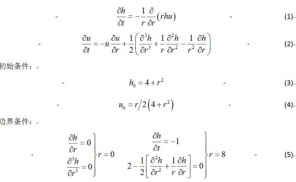 方程形式和计算结果如附件所示,文献里给出的算法是Lax-Wendroff有限差分格式,请哪位大侠指导给出具体的求解过程,比如如何做差分迭代格式。 还有就是r=8处的边界条件,应该怎么应用呢?我现在用第一个条件算h在r=8处下一时刻的值,而第二个条件用来离散算r=8外的点n+1和n+2,从而用来计算h的三阶偏导数,不知道这样处理对不对。 差分方程01.jpg 差分方程04.jpg |