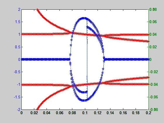 程序代码如下: clear clc syms x a=0.001:0.001:0.2; %M=size(a) for i=1:200 f=x^4-2i*(10^-5)*x^3-x^2*(24^2+(-1+(0.3*2.4048/0.015/2/pi)^2)/a(i))+2i*x*10^-5*(0.3*2.4048/0.015/2/pi)^2/a(i)+(0.3*2.4048/0.015/2/pi)^2*24^2/a(i); result=solve(f); x1=real(result)/24; x2=imag(result)/24; y1(i)=x1(1, ;%y2(i)=x1(2, ;y3(i)=x1(3, ;y4(i)=x1(4, ;z1(i)=x2(1, ;z2(i)=x2(2, ;z3(i)=x2(3, ;z4(i)=x2(4, ;end plotyy(a,y1,a,z1)%','g *''b *' axis([0 0.2 -2 2]); hold on plotyy(a,y2,a,z2)%'g *' hold on plotyy(a,y3,a,z3) hold on plotyy(a,y4,a,z4) %axis([0 0.2 -2 2]); %plotyy(a,x1(1, ,a,x2(1, )我觉得这样讲八条曲线画到一个图形中不太对,这样的话八条曲线都只能用实线表示,怎么样让不同的曲线用不同的符号表示?比如点号星号之类的。我画出的图形和需要的图形如下:怎样画出需要的那样?谢谢![ Last edited by watertxf on 2013-10-20 at 11:16 ] |