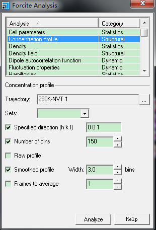 已经得到了模拟的轨迹文件,想做出以z轴为横坐标的密度分布曲线,我使用forcite中的Analysis没有做出来,求指导