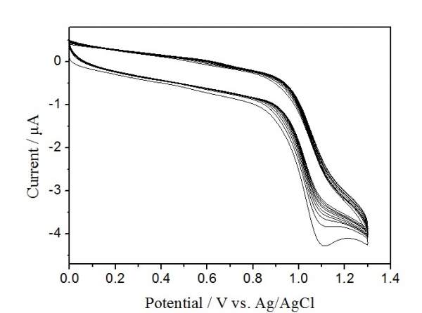 1 用二氧化钛纳米管修饰到玻碳电极上检测丁香酚酚,在乙腈体系做循环伏安图