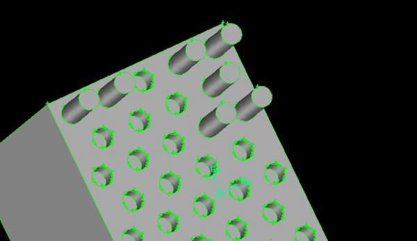 在如下模型中,每个圆柱体插入炉膛部分这头有6个孔,怎么划圆柱体和长方体(去掉了长方体与圆柱体相同的部分)的网格?