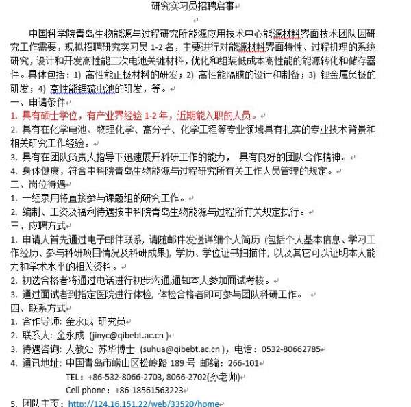中科院青岛能源所能源材料界面技术团队 硕士学历招聘