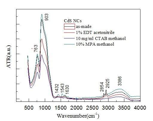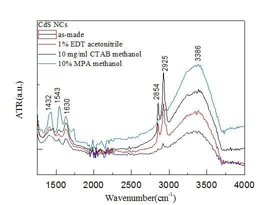 RT,近期用油胺合成了下CdS纳米粒子,直接在载玻片上旋涂CdS薄膜,分别用1% 乙二硫醇的乙腈溶液,10% 3巯基丙酸的甲醇溶液和10mg/mL 十六烷基三甲基溴化铵的甲醇溶液来清洗薄膜,由于不太懂傅立叶红外分析,求助大虫帮忙分析分析,不甚感激 CdS FTIR.jpg CdS FTIR.jpg |