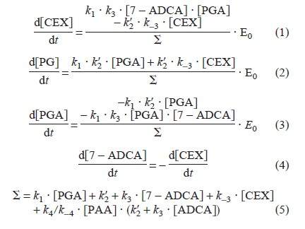 4UVQ4KBW0G%WSU$F5BCNI3G.jpg如图,此为酶反应方程式 更具此方程式,推出如下图方程式3W2@O]QLUNQKE0DK01}}M)C.jpg、CR4II%FHW6YF6@PNI0AF8B1.jpg。 其中方程6、7中的7-adca0 ,PGA0是初始浓度,k1,k2‘为已知常数,如何求得k3、k-3、K4/K-4,然后如何画出cex、pg、pga三者的图???? 3W2@O]QLUNQKE0DK01}}M)C.jpg CR4II%FHW6YF6@PNI0AF8B1.jpg 4UVQ4KBW0G%WSU$F5BCNI3G.jpg |