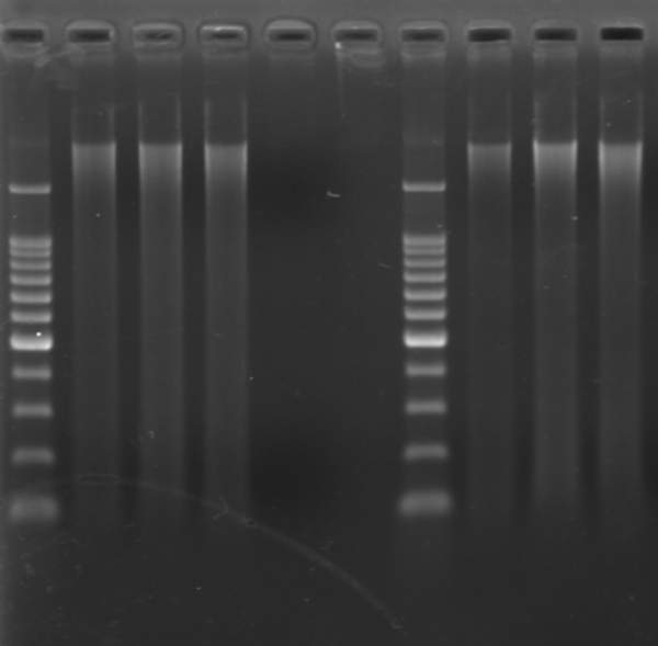 请问各位大虾,用试剂盒提取土壤中DNA,没有人家的配套仪器(太贵了),用的实验室的涡旋仪,提取的DNA貌似不是在一个条带上,跑电泳出来在在泳道上很长一段~