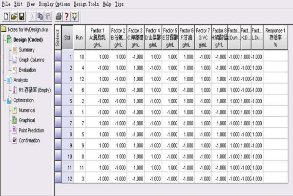 本人想验证一篇文献<<响应面法优化鼠李糖乳杆菌冻干保护剂配方的研究>>中的实验结果,作者使用Minitab 16.1软件进行Plackett-Burman试验设计和分析,见截图1。但是我使用Design-Expert 7软件来验证文章中的数据,发现生成的列表不一致,无法验证,见截图2。请问什么原因导致的?如何才能解决啊?十分谢谢! 截图1.jpg 截图2.jpg |