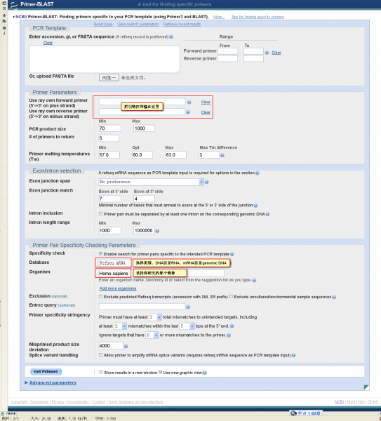 我想进行引物的特异性检验,进入primer-blast,怎么设置一些相关参数?