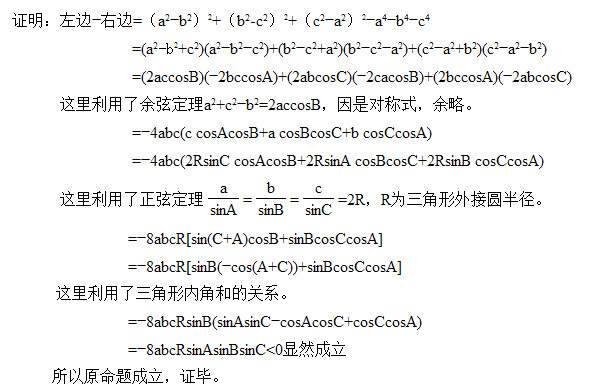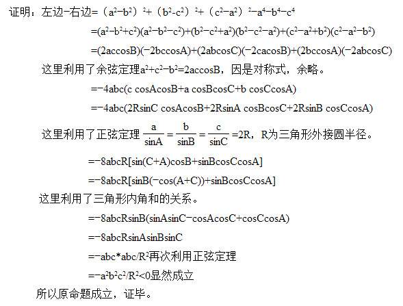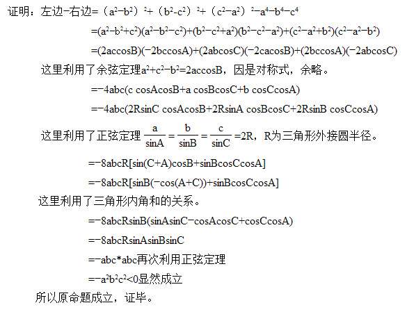 设a,b,c,是三角形的边长,求证:a4+b4+c4<2(a2b2+a2c2+b2c2),注:前面的均是4次方,后面的均是平方