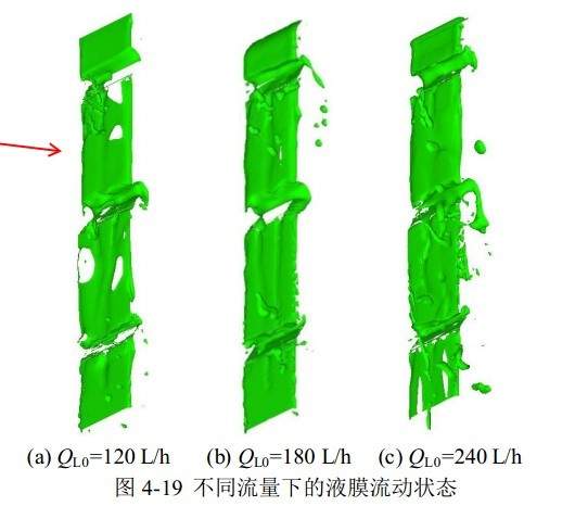 第1幅:这个是模拟一个波纹板降膜上的液膜,在液体波纹板表面向下流动形成一层液膜,改变液体的流量得到的液膜形态就不一样,图示的就是液膜的形态。
