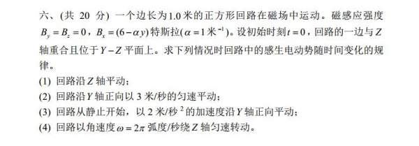 第四小问,用文字不容易描述清楚,无非就是其中的一条边切割磁力线u=blv。然后求出。。画一下图应该很容易作出来的,楼主加油