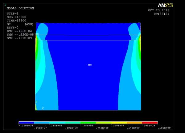 三层不同的材料,平面应力模型,我在上表面施加了一个随时间变化的温度载荷,下表面设定了对流和Y方向位移约束,左右端面没有赋任何条件,为什么我温度分布是这样均匀的,但是我的应力分布就靠向两边了。 12.jpg t=15600温度分布.jpg t=15600Y方向应力分布.jpg |