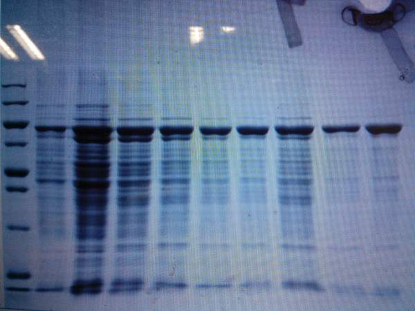 我用的是毕赤酵母X-33菌株,marker分子量是250、150、100、70、50、40、30、20、15、10、5 除marker外其余全是样品,我的蛋白大小事74kd左右,但是最上面的条带是什么,是菌株本身的条带吗?有没有用野生型X-33跑SDS-PAGE的,求解 IMG_20131029_214405.jpg |
