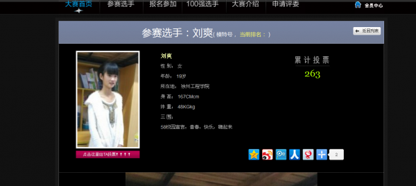 请您花5秒钟帮忙投一下票,请您投票:点击这里给她投票!!!!刘爽! 可能的话请您11月11日前每天帮忙投一票,不用注册之类的过程,直接点开链接投票。每个IP每天只能投一次。 每投票一次回帖即送上5枚金币或者一朵红花意思一下,以表谢意!每个ID不限次数放送金币! 回复一下您投票后的得票数即可,由于系统设置,光回复数字可能我无法手工送金币,所以请您回帖时拷贝稍微多一些的文字。再次感谢, 投票链接: http://dasai.58xyw.net/Xuzhou/xuzhougongchengxueyuan/6183.html -1-1310291J141349.jpg 请大家不要再投了 已经出局了 感谢大家! [ Last edited by hf6391964 on 2013-11-4 at 15:18 ] |