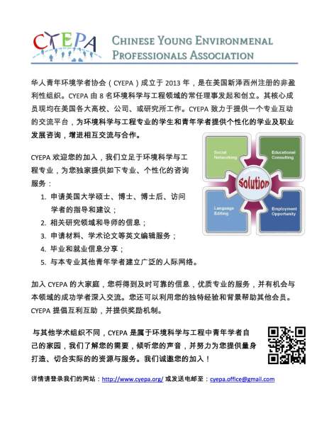 华人青年环境学者协会(CYEPA)成立于 2013 年,是在美国新泽西州注册的非盈 利性组织。CYEPA 由 8 名环境科学与工程领域的常任理事发起和创立。其核心成 员现均在美国各大高校、公司、或研究所工作。CYEPA 致力于提供一个专业互动 的交流平台,为环境科学与工程专业的学生和青年学者提供个性化的学业及职业 发展咨询,增进相互交流与合作。 CYEPA 欢迎您的加入,我们立足于环境科学与工 程专业,为您独家提供如下专业、个性化的咨询 服务: 1. 申请美国大学硕士、博士、博士后、访问 学者的指导和建议; 2. 相关研究领域和导师的信息; 3. 申请材料、学术论文等英文编辑服务; 4. 毕业和就业信息分享; 5. 与本专业其他青年学者建立广泛的人际网络。 加入 CYEPA 的大家庭,您将得到及时可靠的信息,优质专业的服务,并有机会与 本领域的成功学者深入交流。您还可以利用您的独特经验和背景帮助其他会员。 CYEPA 提倡互利互助,并提供奖励机制。 与其他学术组织不同,CYEPA 是属于环境科学与工程中青年学者自 己的家园,我们了解您的需要,倾听您的声音,并努力为您提供量身 打造、切合实际的的资源与服务。我们诚邀您的加入! 详情请登录我们的网站:http://www.cyepa.org/ 或发送电邮至:cyepa.office@gmail.com CYEPA Flyer_中文.jpg |