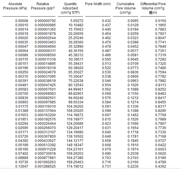 RT,最近做了个活性炭的氩气(Ar)等温吸附测试,主要是想看看材料的孔分布。吸脱附曲线如下 在画孔分布(PSD)图时横坐标一般都是孔径(Pore width),对于纵坐标dV/dW是仪器自己给的吗? dV/dW是不是累计孔体积的增量除以孔径的增量得到的?例如横坐标是0.445,那么dV/dW=(0.0194-0.0129)/(0.445-0.437)? 吸附等温线.png HK.png |