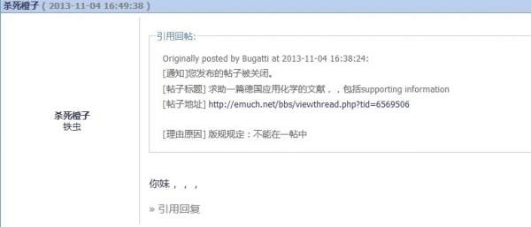 ID 杀死橙子 在文献版版主对其帖子进行正常管理后,使用了极其不文明的言语,根据版规,文献版禁言一个月。 相关证据 禁言依据 https://muchong.com/bbs/viewthread.php?tid=6306288 |