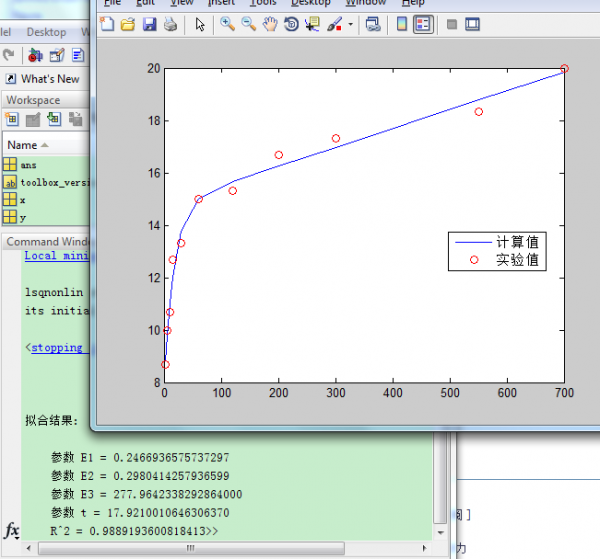 本人非计算模拟专业,小白一枚,但最近需要模拟参数,不知如何运用matlab求参数,顾求助各位大神。 模型表达式: y=a/E1 +a/E2[1-exp(-x/t)]+a*x/E3 其中:x=[2,5,10,15,30,60,120,200,300,550,700]; y=[8.66667,10,10.66667,12.66667,13.33333,15,15.33333, 16.66667,17.33333,18.33333,20]; a=2 未知参数:E1,E2,t,E3 不知道能否通过matlab拟合参数 请各位大神能鼎力相助,最好能给出代码或者计算方法,谢谢大家! [ Last edited by dshuanger on 2013-11-5 at 11:06 ] |