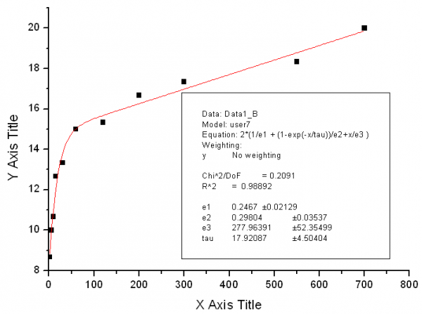 y=2/e1 +2/e2/(1-exp(-x/t))+a*x/3; // a=2 x=[2,5,10,15,30,60,120,200,300,550,700]; y=[8.66667,10,10.66667,12.66667,13.33333,15,15.33333, 16.66667,17.33333,18.33333,20]; 相关系数(R): 1 相关系数之平方(R^2): 1 决定系数(DC): 0.999999999996653 卡方系数(Chi-Square): 1.64243431014082E-11 参数 最佳估算 ---------- -------------- e1 =1.2090897803241 e2 =3.11591327892529 t =0.00209072546506921 ====== 输出结果 ===== No. Observed y Calculated y 1 8.66667 8.66666365993411 2 10 9.99999365993411 3 10.66667 10.6666636599341 4 12.66667 12.6666636599341 5 13.33333 13.3333236599341 6 15 14.9999936599341 7 15.33333 15.3333236599341 8 16.66667 16.6666636599341 9 17.33333 17.3333236599341 10 18.33333 18.3333236599341 11 20 19.9999936599341 |