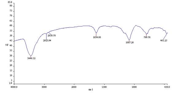 个人认为1087和799是石英,461可能是Si-O振动。3446和1634是OH,2923和2850是脂肪-CH2。