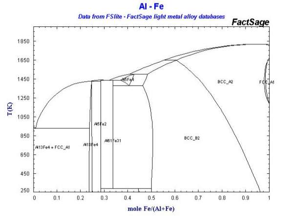 二元相图Al-Fe和Fe-Al是一样的嘛。 找相图我一般去http://www.crct.polymtl.ca/FACT/documentation/ 最后发一个你想要的Al-Fe相图 |