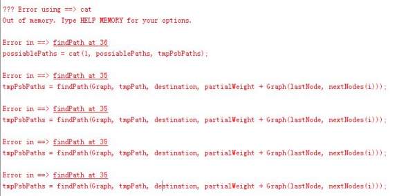 有各节点的权值矩阵,要找出图中起点和终点的所有路径 问题一:程序的清晰、具体的思路是什么?初学MATLAB,好难理清这个程序一步步是怎么算的 问题二:矩阵超过10X10之后,就运行不出来 程序如下: function possiablePaths = findPath(Graph, partialPath, destination, partialWeight) % findPath按深度优先搜索所有可能的从partialPath出发到destination的路径,这些路径中不包含环路 % Graph: 路网图,非无穷或0表示两节点之间直接连通,矩阵值就为路网权值 % partialPath: 出发的路径,如果partialPath就一个数,表示这个就是起始点 % destination: 目标节点 % partialWeight: partialPath的权值,当partialPath为一个数时,partialWeight为0 pathLength = length(partialPath); lastNode = partialPath(pathLength); %得到最后一个节点 nextNodes = find(0<Graph(lastNode, & Graph(lastNode, <inf); %根据Graph图得到最后一个节点的下一个节点GLength = length(Graph); possiablePaths = []; if lastNode == destination % 如果lastNode与目标节点相等,则说明partialPath就是从其出发到目标节点的路径,结果只有这一个,直接返回 possiablePaths = partialPath; possiablePaths(GLength + 1) = partialWeight; return; elseif length( find( partialPath == destination ) ) ~= 0 return; end %nextNodes中的数一定大于0,所以为了让nextNodes(i)去掉,先将其赋值为0 for i=1:length(nextNodes) if destination == nextNodes(i) %输出路径 tmpPath = cat(2, partialPath, destination); %串接成一条完整的路径 tmpPath(GLength + 1) = partialWeight + Graph(lastNode, destination); %延长数组长度至GLength+1, 最后一个元素用于存放该路径的总路阻 possiablePaths( length(possiablePaths) + 1 , : ) = tmpPath; nextNodes(i) = 0; elseif length( find( partialPath == nextNodes(i) ) ) ~= 0 nextNodes(i) = 0; end end nextNodes = nextNodes(nextNodes ~= 0); %将nextNodes中为0的值去掉,因为下一个节点可能已经遍历过或者它就是目标节点 for i=1:length(nextNodes) tmpPath = cat(2, partialPath, nextNodes(i)); tmpPsbPaths = findPath(Graph, tmpPath, destination, partialWeight + Graph(lastNode, nextNodes(i))); possiablePaths = cat(1, possiablePaths, tmpPsbPaths); end %输入桐乡到富阳的高速公路网络图的边权矩阵 a=[0,62,66,inf,inf,inf,inf; 62,0,inf,25,11,inf,inf; 66,inf,0,9,inf,inf,49; inf,25,9,0,11,14,inf; inf,11,inf,11,0,13,inf; inf,inf,inf,14,13,0,35.8; inf,inf,49,inf,inf,35.8,0;]; %调用搜索图中任意两点间所有路径的M文件 findPath(a, 1, 7, 0) 程序来源http://www.ilovematlab.cn/thread-212175-1-1.html 或者http://www.360doc.com/content/11/0818/21/2617151_141536552.shtml |