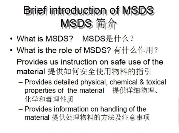 化学品安全说明书(Material Safety Data Sheet),国际上称作化学品安全信息卡,简称MSDS,是化学品生产商和进口商用来阐明化学品的理化特性(如PH值,闪点,易燃度,反应活性等)以及对使用者的健康(如致癌,致畸等)可能产生的危害的一份文件。是一份关于危险化学品的燃、爆性能,毒性和环境危害,以及安全使用、泄漏应急救护处置、主要理化参数、法律法规等方面信息的综合性文件,是传递化学品危害信息的重要文件。 |