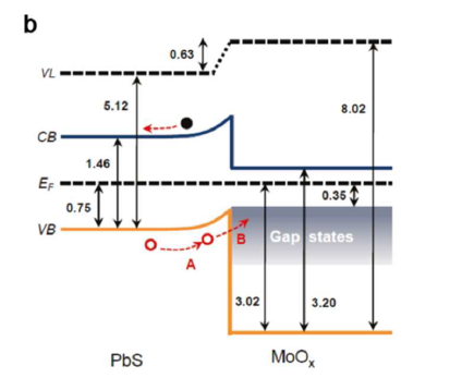 刚开始学习一些半导体物理方面的东西,对真空能级的理解感到很困惑: 1. 真空能级是恒定的吗? 2. 为什么途中PbS 和MoOx两者的真空能级不在一条直线上? 3. 真空能级差0.63eV有什么意义吗? 4. MoOx的Gap States是什么意思? PbS和MoOx接触 |