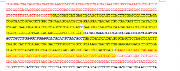 各位大侠谁能帮我分析一下 图片中的序列怎么进行rt-pcr,其中红色字体为反向互补的两个序列,黄色底纹的是两个序列一致的片段,黑色字体位于两个黄色相同序列直接的间隔区,求高手指点 要做这个片段的5‘race。谢谢! 图片1.png |