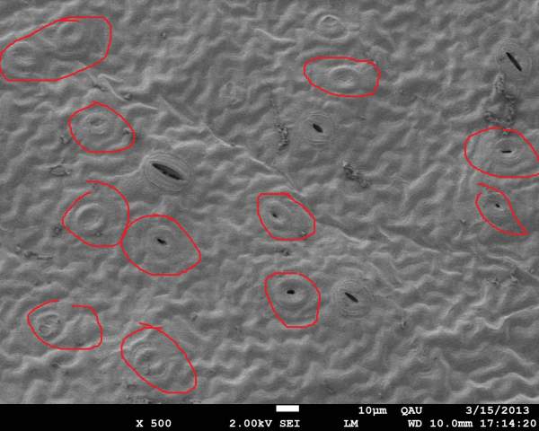 | 请问我红色标记出来的是不是未发育完全的气孔啊?请植物学高手帮忙鉴定一下,非常感谢! |