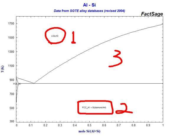 1、请教一个问题,请问相图是怎么分析的,比如下图的Al-Si相图,其中红色标记的1和2两处表示什么意思,没有标记的3区域又是什么含义?谢谢 2、哪位有Si和Ga的相图,能否发一份,谢谢 [ Last edited by congqin312 on 2013-11-18 at 11:48 ] |