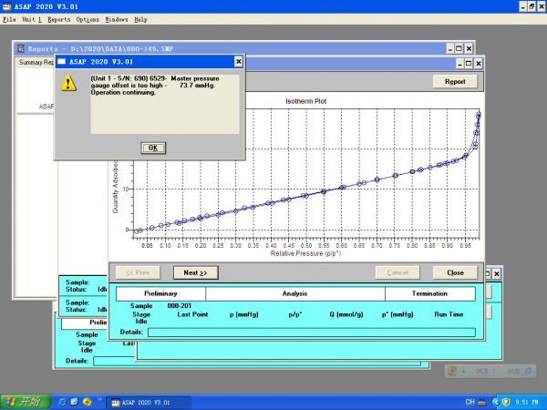 | 你用的2020啊,设点和选点都有些问题。Y型分子筛属于微孔分子筛,所以低压区要做的点很多,麦克仪器低压区用注气量来控制压力点,高于0.01后用设置点来控制。模型计算选点也有些问题!BET选点要求线性4个9,C常数要为正值。 |