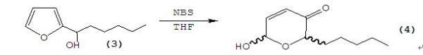 将上一步得到的2-呋喃基-正戊基甲醇3(0.897g,5.34mmol)溶于THF:H2O=4:1的混合溶剂中,向溶液中分批加入NBS(N-溴代丁二酰亚胺),每次加入应待NBS进入体系所呈现的黄绿色消失后为宜,共加入NBS 1.0g(5.6mmol)。整个反应温度控制在0℃左右。TLC检测反应是否完毕。