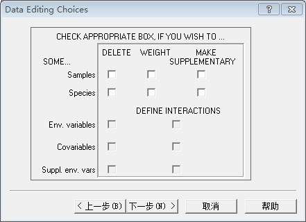 今天弄CANOCO做冗余分析,按照使用手册一步一步来的,但是到了这步就进行不下去了,哪位高手能给指点一下。 使用手册的这个见面第三行是可选的,而我的界面第三行是灰色,不可选的,这是怎么回事啊!!我哪里出错了!? 使用手册的图片 我的界面 |