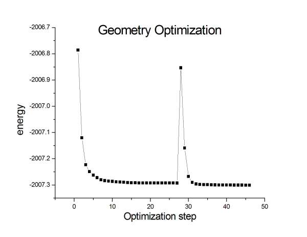 问题:我用dmol3 对一个有机物的结构进行优化,结果优化过程中能量出现了极大值,随后又降低,过段时间又重新出现,请问各位高手,这是什么原因造成的?