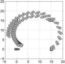 各位高手,现在我已经做好一个点可以在一个x-y平面上的轨迹曲线,比如沿sin曲线或者圆圈运动,我希望能够用一个小图标或者自定义的某种特殊图形替换这个点,在最后画出的图中可以通过它的不同旋转角度表示这个点当时的位形,图形的一个角一直朝着运动的正方向。这个该怎么做? 下面是一个例子,比如 x = 0:0.1:2*pi; y = sin(x); theta = atan(cos(x)); 一个点在这个曲线上运动,x,y确定它的位置,theta确定它前进的方向(与x轴的夹角),现在matlab里可以用+ - . x o等做图,但看不到每个点在每一刻的方向是什么,我希望用一个小图标或自定义图形(比如一个长三角形,一个直角,或一个小图片等)代替这个点,更直观的看到它在这个平面上运动的状态,既能看到位置,也能看到方向。 请各位帮忙。 |