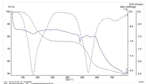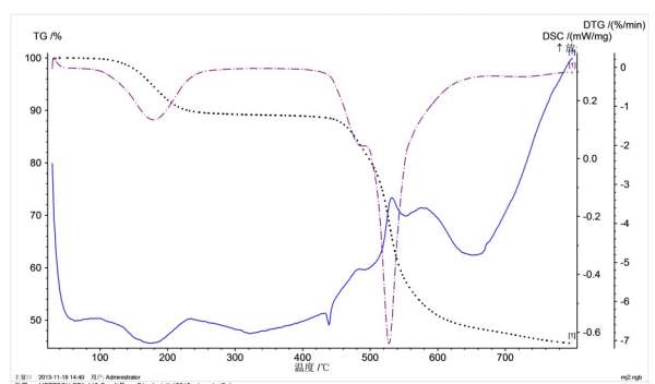 图3上,200℃之前第一个失重对应一个吸热峰,应该是低沸点组分的挥发。400℃附近好像有个熔融吸热,500℃以上的一个失重台阶,对应了放热峰,应该是其中组分的分解;