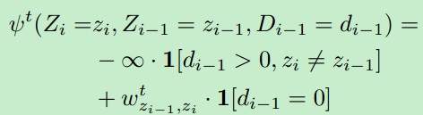 The second potential encompasses both the state and duration variables, and measures the score of transitioning between states, provided we are allowed to transition:
